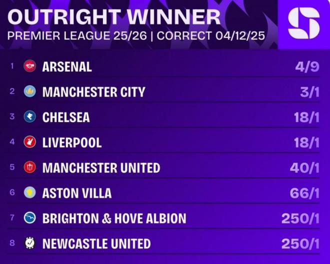 《转会市场》统计了2025年英超总积分情况,阿森纳多赛1场力压曼城居首的。